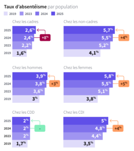 Malgré l’évolution des profils, les inégalités persistent. Le taux d’absentéisme des femmes atteint 5,8 % en 2025, contre 3,9 % pour les hommes. L’écart continue ainsi de se creuser.