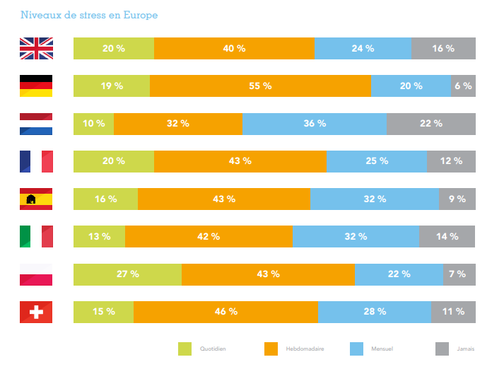 Près d’un salarié européen sur cinq (18 %) affirme souffrir quotidiennement du stress, soit une hausse de 5 % en un an. Plus préoccupant encore, trois salariés européens sur dix (30 %) se sentent tellement stressés qu’ils envisagent de changer d’emploi, un chiffre qui atteint les 37 % chez les moins de 35 ans. Le pays le plus stressé ? La Pologne où plus d’un quart (27 %) des salariés affirment souffrir quotidiennement du stress, suivis par 20 % des salariés français et britanniques. Les Pays-Bas semblent avoir le moins de problèmes de stress, avec seulement un salarié sur dix (10 %) déclarant se sentir stressé chaque jour.